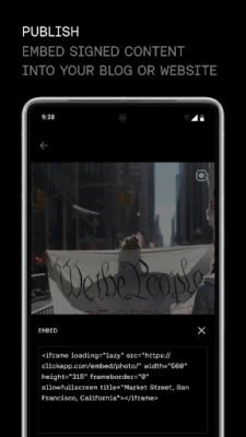 مع "Click"، يصبح توثيق الوسائط أمرًا بسيطًا ومؤكدًا في ثلاث خطوات ميسرة. ابدأ بالتقاط صورك ومقاطع الفيديو الخاصة بك مباشرةً من خلال التطبيق. بعد ذلك، قم بتأكيد أصالة المحتوى الخاص بك عبر تقنية ContentSign المدمجة، والتي تُسجل تفاصيل دقيقة مثل الموقع الجغرافي، التوقيت، ونوع الجهاز المستخدم، وذلك باستخدام قوة البلوك تشين لإنشاء بصمة رقمية فريدة وثابتة لا يمكن التلاعب بها. أخيرًا، شارك محتواك الموثوق بثقة، واجعل من السهل على الآخرين رؤية أعمالك وتوثيقها، مع إمكانية التحقق العلني من صحتها عبر الويب أو التطبيق مباشرة، وحتى تضمينها بسهولة في أي موقع إلكتروني أو مدونة.